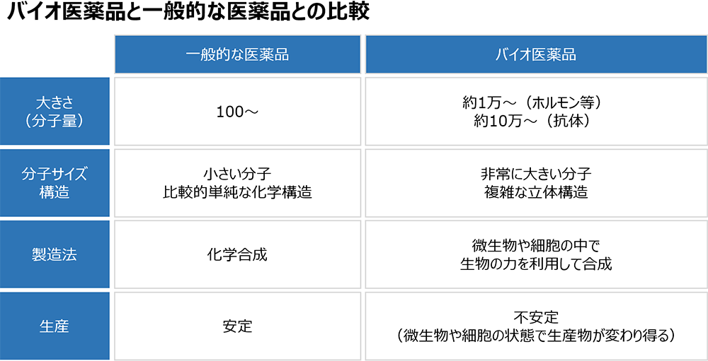 一方、「バイオシミラー」は、複雑なタンパク質を有効成分とする医薬品であるため、特許が切れた薬と全く同じものを作ることができません。