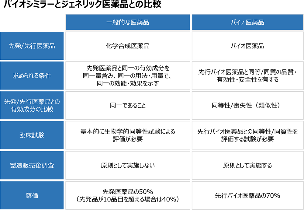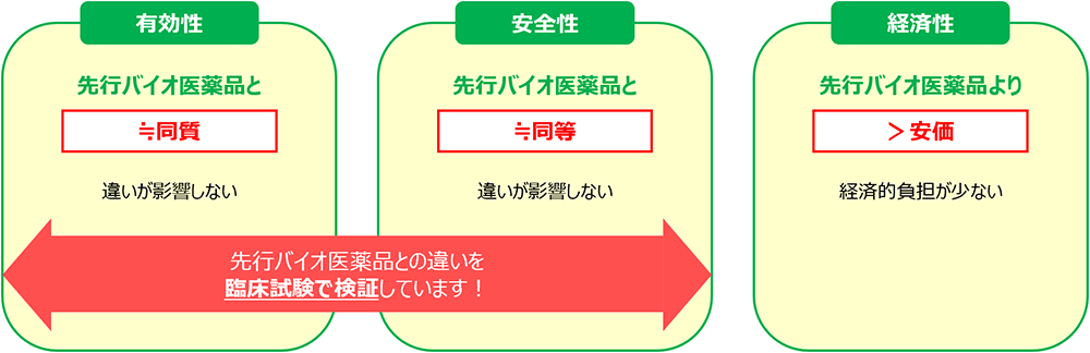 普通の薬のジェネリックに相当しますが、もとの「バイオ医薬品」と同等・同質の品質・安全性・有効性を有する医薬品であることが臨床試験で確認されています。