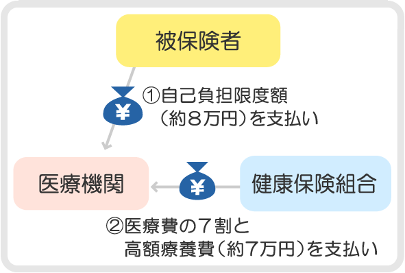 事前に健康保険組合に申請して限度額適用認定証が交付されたら医療機関の窓口に提示してください。 それにより、窓口での支払いが自己負担限度額までにおさえられます。
