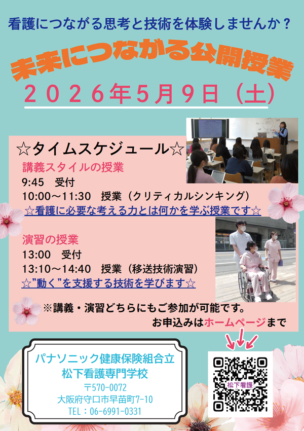 当校の受験をお考えいただいている受験生ならびに保護者の方、高等学校の先生を対象に、少しでも松下看護専門学校を知っていただきたいと思い、「公開授業」を開催します!